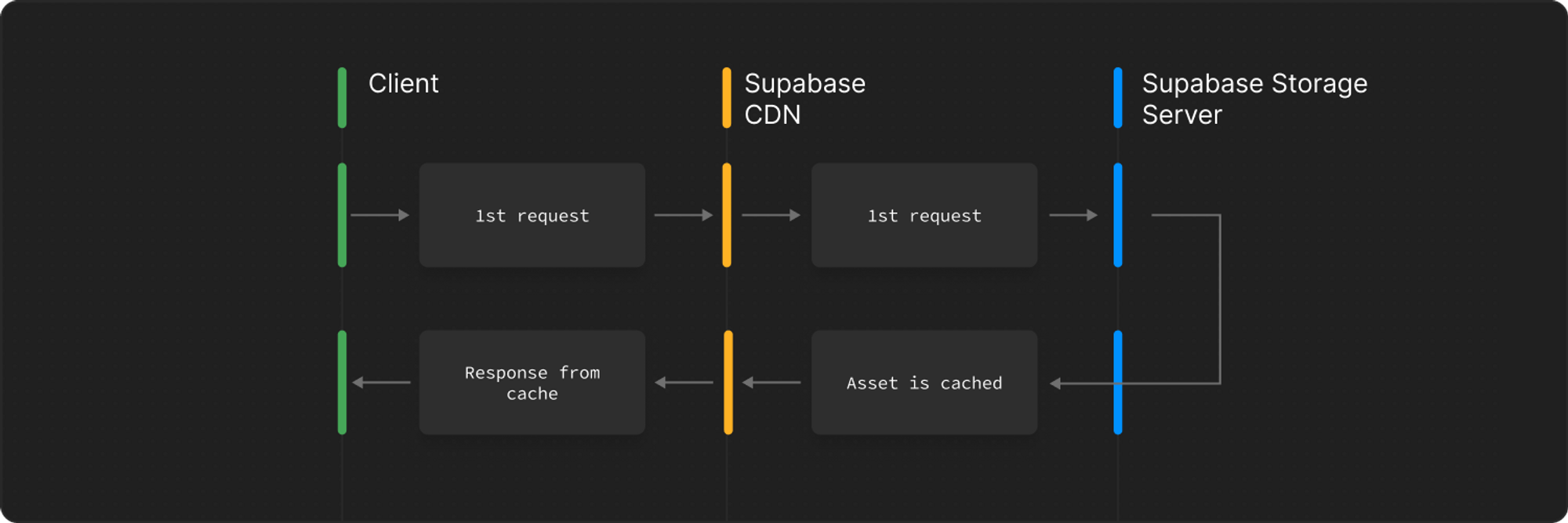 A new bucket is created for a Supabase project launched in Singapore. All requests to the Supabase Storage API are routed to the CDN first.